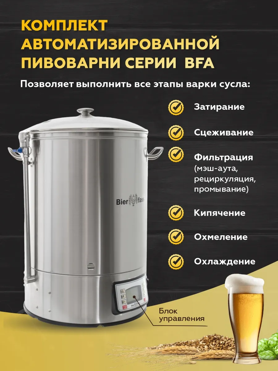 до 40 л сусла, полный комплект аксессуаров, автоматический контроль + чиллер, фальшдно, хопспайдер. С пивоварней BFA-40L Bierfass вы получаете не просто оборудование — завершённый комплект для варки пива прямо у себя дома, без лишней суеты и с отличным результатом.