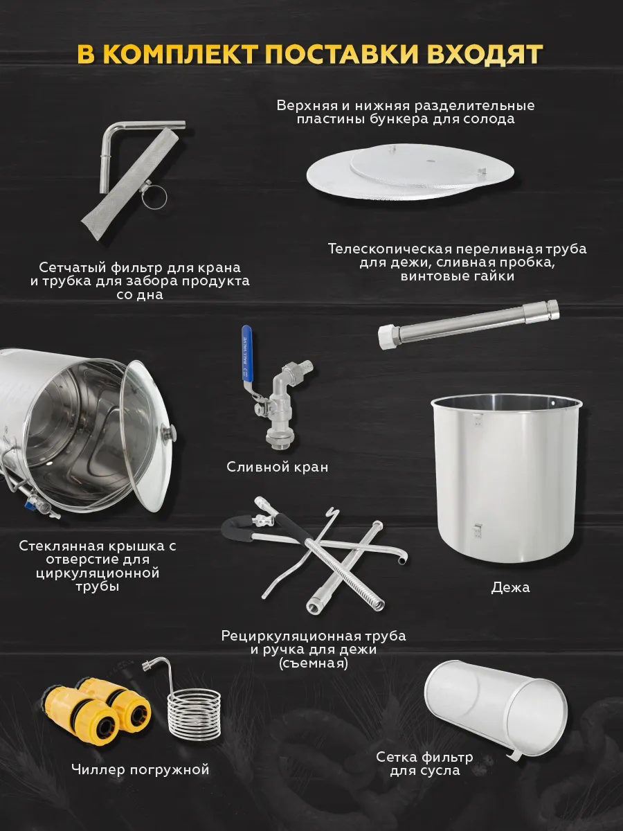 Конечное качество пива обеспечивают корпус, встроенный насос, равномерный нагрев, автоматизированное управление, богатая комплектация и использование сопутствующего оборудования (Ферментационная емкость для брожения, жерновая мельница)